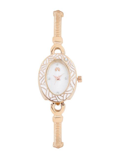 Simple watch with an oval case, has a settled bezel with finished detail and a stainless steel back. Mother of pearl decorated dial. A screw to reset the time.Rose gold-toned wristband style strap, secured with a crease over fasten.Water-safe.
