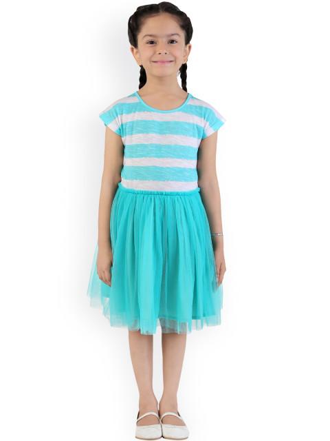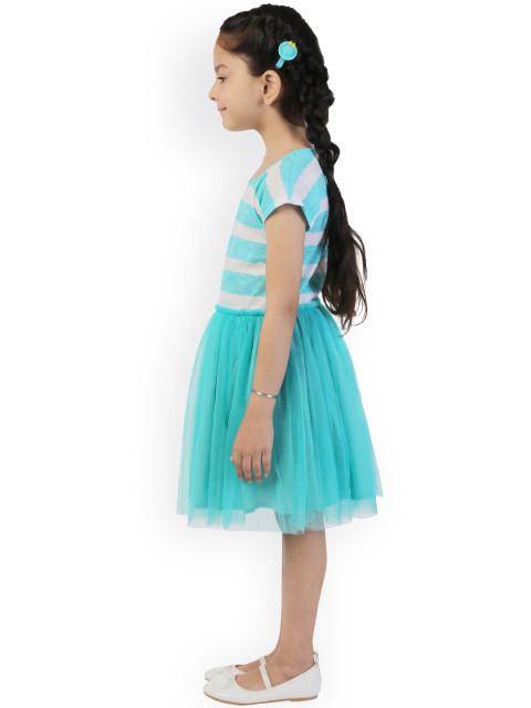 Sea green striped weave and woven fit and flare dress, has a round neck, amplified short sleeves, flared trim, a connected covering.