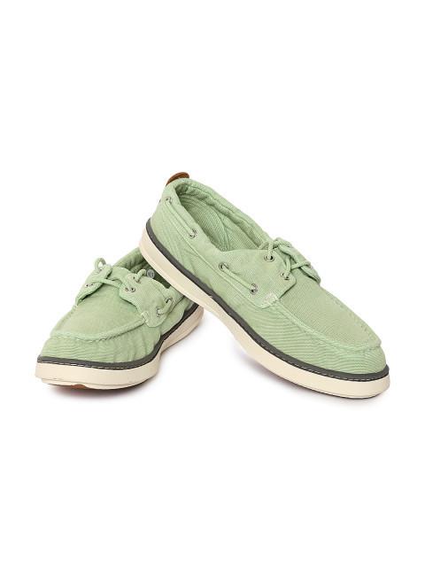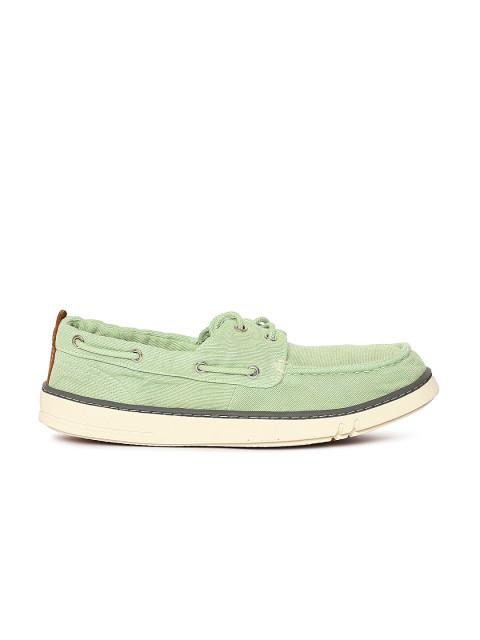 A couple of square-toed green boat shoes,has standard styling, bind ups detail.Canvas upper padded footbed.Textured and designed outsole.