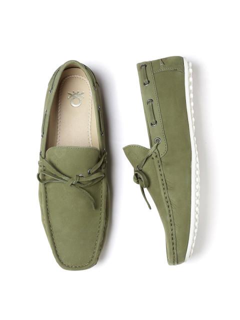 A couple of olive green square-toed boat shoes, has focal trim ups.Leather upper, has ribbon and eyelet detail along the mouth and a strengthened heel neckline padded footbed.Textured outsole with designed notches.